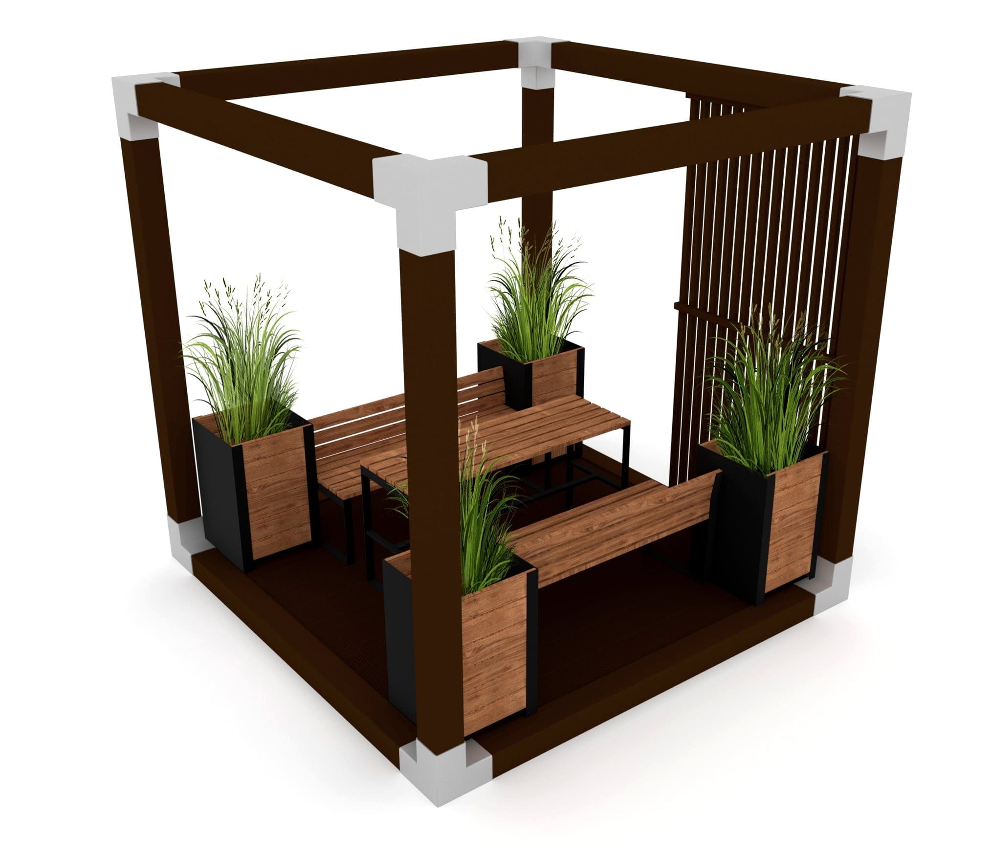 Altany świetnie sprawdzają się w aranżacji parków i terenów rekreacyjnych do jedzenia lub cieszenia się chwilami relaksu z dala od słońca. Altana jest meblem, który w różnych formach i wymiarach stanowi przyjemne połączenie praktyczności i rozrywki zarówno dla dorosłych, jak i dzieci. Elementy wyposażenia to: ławki z oparciem, stół piknikowy, donice na rośliny oraz panel boczny. Wymiary to 2,80 m x 2,80 m x 2,80 m (szerokość x długość x wysokość). Istnieje możliwość doposażenia urządzenia w lampę solarną oraz żagiel przeciwsłoneczny.