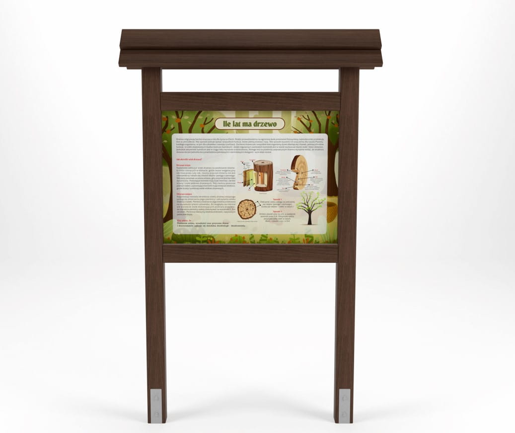 Stelaż z drewna iglastego z certyfikatem FSC, dwukrotnie impregnowany, przygotowany do montażu na kotwach stalowych w ocynku ogniowym. Powierzchnia ekspozycyjna 100x75 cm. Ekran z aluminium kompozytowego 3mm. Wydruk ekosolwetnowy + laminat UV lub druk bezpośredni UV. Słupy nośne o wymiarach 10x10 cm. Daszek dwuspadowy z desek na zakładkę.